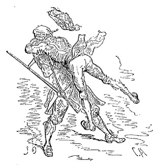 Ils portent leur tête sous le bras droit, et, lorsqu'ils vont en voyage ou qu'ils ont à exécuter quelque travail qui exige beaucoup de mouvement, ils la laissent habituellement à la maison; car ils peuvent lui demander conseil à n'importe quelle distance.