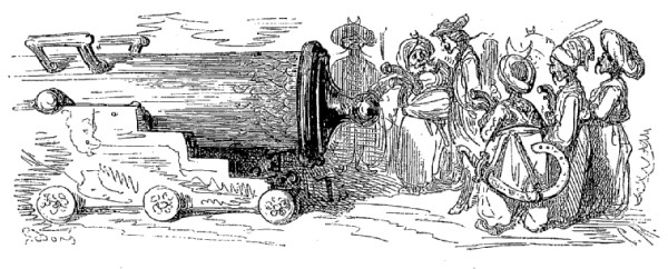Je m'étais rendu à Wapping pour surveiller l'embarquement de divers objets que j'envoyais à plusieurs de mes amis de Hambourg; l'opération terminée, je revins par le Tower Wharf. Il était midi, et j'étais horriblement fatigué; pour échapper à l'ardeur du soleil, j'imaginai de me fourrer dans un des canons de la tour afin de prendre un peu de repos: à peine installé, je m'endormis profondément. Or, il se trouvait que nous étions précisément au 1er juin, jour anniversaire de la naissance du roi Georges III, et, à une heure, tous les canons devaient tirer pour fêter cette solennité. On les avait chargés le matin, et comme personne ne pouvait soupçonner ma présence en pareil lieu, je fus lancé par-dessus les maisons, de l'autre côté du fleuve, dans une cour de ferme, entre Benmondsey et Deptford. Je tombai sur une grande meule de foin, où je restai sans me réveiller,—ce qui s'explique par l'étourdissement qui m'avait saisi dans le trajet.