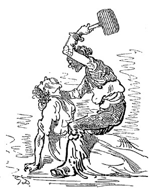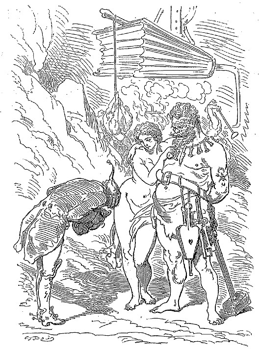 Si je me plaisais à la conversation instructive du mari, je goûtais encore davantage la société de la femme, et je n'aurais peut-être jamais quitté ce palais souterrain, si quelques mauvaises langues n'avaient mis la puce à l'oreille au seigneur Vulcain, et n'avaient allumé dans son cœur le feu de la jalousie. Sans me prévenir le moins du monde, il me saisit un matin au collet, comme j'assistais la belle déesse à sa toilette, et m'emmena dans une chambre que je n'avais pas encore vue: là il me tint suspendu au-dessus d'une espèce de puits profond, et me dit: «Ingrat mortel, retourne dans le monde d'où tu es venu!»