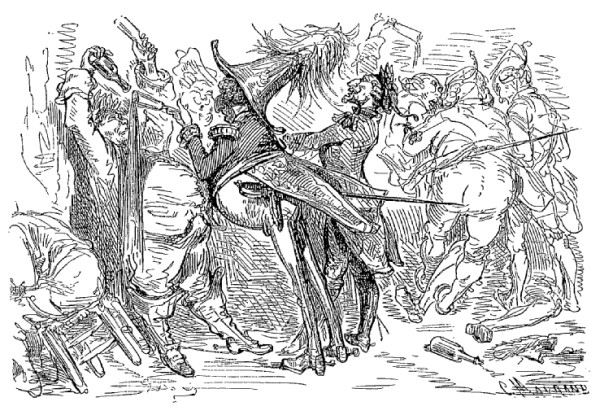 Comme mon lithuanien allait extrêmement vite, je me trouvai le premier sur le dos des fuyards, et, voyant que l'ennemi courait si bien vers l'autre issue de la ville, je jugeai bon de m'arrêter sur la place du marché et de faire sonner le rassemblement. Mais figurez-vous mon étonnement, messieurs, en ne voyant autour de moi ni trompette ni aucun de mes hussards!