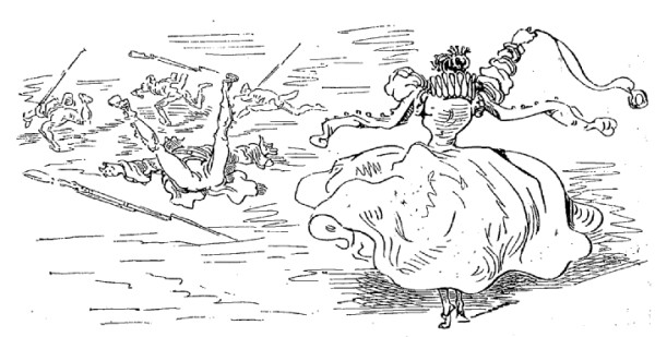 Tout, dans ce monde-là, est extraordinairement grand: une mouche ordinaire, par exemple, est presque aussi grosse qu'un de nos moutons. Les armes usuelles des habitants de la lune sont des raiforts qu'ils manœuvrent comme des javelots, et qui tuent ceux qui en sont atteints. Lorsque la saison des raiforts est passée, ils emploient des tiges d'asperges. Pour boucliers, ils ont de vastes champignons.