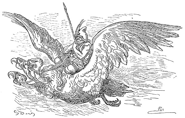 Dans la lune,—car c'était là l'île étincelante où nous venions d'aborder,—nous vîmes de grands êtres montés sur des vautours, dont chacun avait trois têtes. Pour vous donner une idée de la dimension de ces oiseaux, je vous dirai que la distance mesurée de l'extrémité d'une de leurs ailes à l'autre est six fois plus grande que la plus longue de nos vergues. Au lieu de monter à cheval, comme nous autres habitants de la terre, les gens de la lune montent ces sortes d'oiseaux.