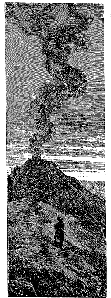 Je fis trois fois le tour du cratère,—dont vous pouvez avoir une idée en vous figurant un immense entonnoir,—et reconnaissant que j'aurais beau tourner, cela ne m'avancerait guère, je pris bravement ma résolution, et je me décidai à sauter dedans. A peine eus-je exécuté le saut, que je me sentis comme plongé dans un bain de vapeur brûlante; les charbons ardents qui jaillissaient sans relâche endommagèrent et brûlèrent en tous sens mon pauvre corps.