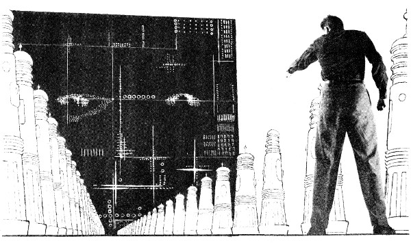 Bristol stalked back toward the base of the calculator, and poked his nose practically into a vision receptor. "It was no thanks to the invading ships that nobody was killed," he said hotly. "And when they came back three days later they killed a lot of people. They occupied the planet and we haven't been able to dislodge them since."