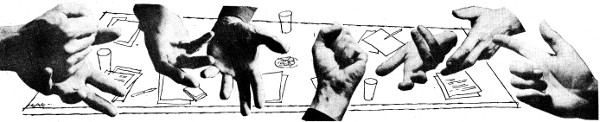 The Secretary of Internal Affairs leaned forward, his short hair bristling. "I think we are wasting our time," he shouted. "I agree with Ralph. I don't believe that the Oracle knows any more about this than we do. If we are going to sit around playing foolish games with words, why don't we do it in a big way? We could hire T.V. time and invite everyone to send in their ideas about what the proverb means on the back of a box-top. Or reasonable facsimile. The contestant with the best answer could get a free all-expense tour to Vega Three. Unless the invaders get here or there first."