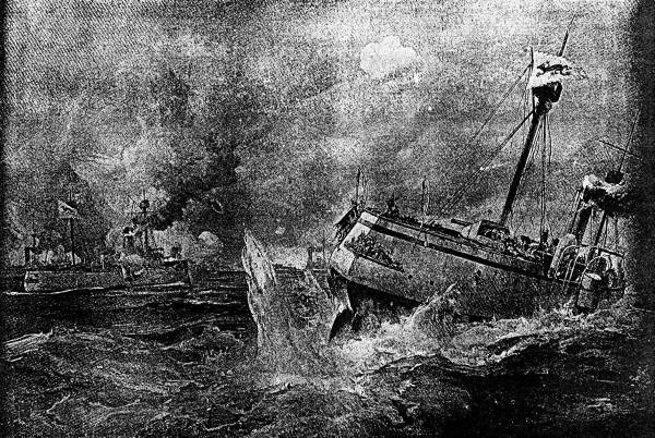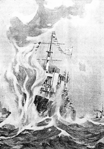 The officers believe that the debut of the submarine boat as an effective agent in naval warfare, or perhaps a large mine caused the disaster to the Kniaz Souvaroff. The damage, however, was so extensive that the flagship soon went down, leaving the deck officers and many of the crew struggling in the waves.