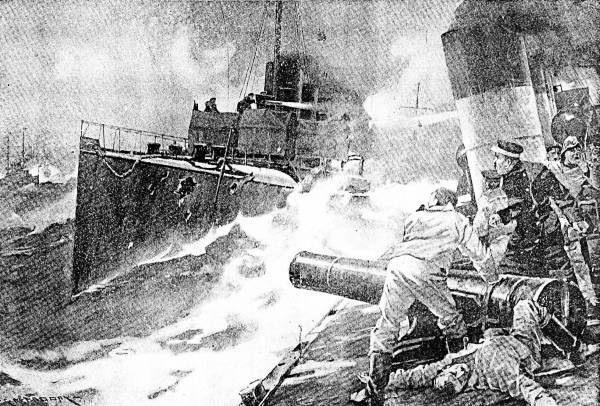 Torpedo attacks were the feature of the Japanese program, which more surely than anything else brought disaster. Torpedo boats in night attacks launched their deadly missiles within a hundred yards of their Russian targets. They completely encircled the Russian ships, swarming like angry hornets. Much of the sweeping character of the victory will ultimately be traced to these comparatively tiny craft, fighting under the shower of shells being hurled from the big guns of the battleships and cruisers far away.