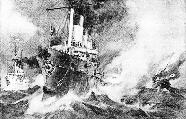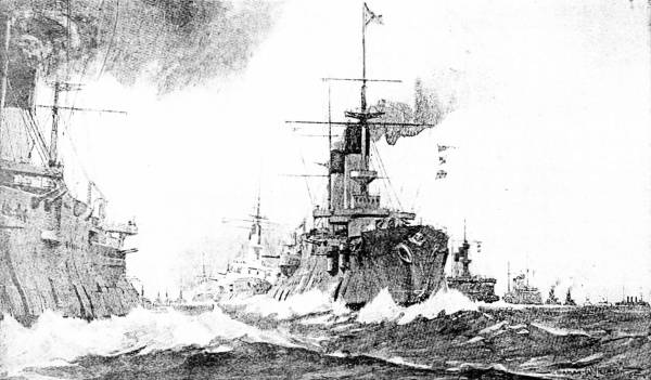 The inhabitants clustered in the streets, thronged the waterside or climbed the frowning hills overlooking the harbor for a better view. Finally, toward 6 o'clock in the evening, a graceful cruiser with two snowy-white stacks, shot in view at the entrance to the Golden Horn and rounded to an anchorage beneath the bristling guns of the curving promontory. From afar the broken stump of her mizzen-mast and a shot hole showing black upon the white paint of one stack indicated that the cruiser had encountered the Japanese. As the anchor chain rattled in the hawse holes the vessel wreathed itself in smoke—it was an admiral's salute in honor of Rear Admiral Von Jessen. Scarcely had the boom of the last cannon begun to echo from the surrounding hills when Von Jessen's flagship, the cruiser Rossia, answered the salute, and a minute later the guns of the fortress took up the cannonade.