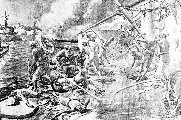 "Third. The weather, the direction of the wind and the sunlight were unfavorable to the Russians, Togo having the sun behind him and firing with the wind, while the Russians had the sunlight in their eyes and fired against the wind.