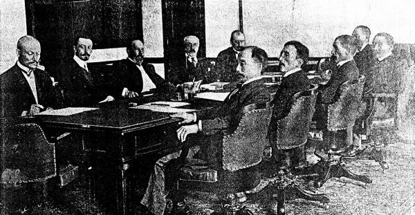 The Russians, from left to right are C. Berg, M. Pokotiloff, M. Witte, Baron Rosen and M. Nabokoff. The Japanese from left to right are Mr. Adatchi, Mr. Otchiai, Baron Komura, Minister Takahira and Mr. A. Sato.
