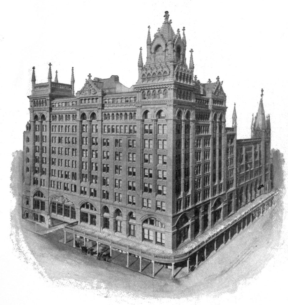 Our trolley ride finished, we alight at Brown’s Palace Hotel. This magnificent structure, covering an entire block, ten stories in height, built of brown sandstone, interior finished in Mexican onyx, and costing the neat little sum of $2,000,000, is the pride of Denver. Here “The H. J. Mayham Investment Company” has its headquarters in a suite of offices on the first floor. We are kindly received by Mr. W. H. Coombs, a representative of the company, who loads us down with illustrated and descriptive books and pamphlets.