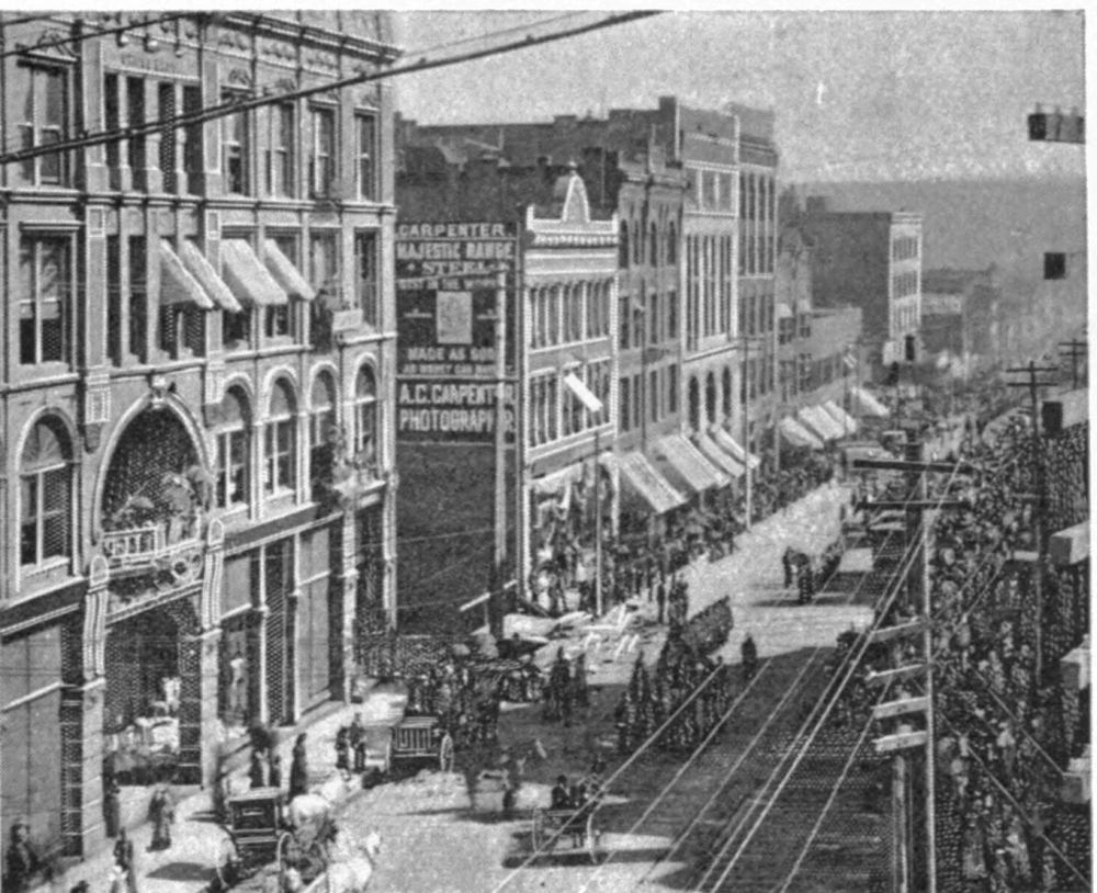 We leave Lincoln with the same engine and crew that brought us from Hastings, and they take us to Pacific Junction, a run of 177 miles. We feel that we are in good hands, for Conductor J. G. Chase was selected to take charge, from Pacific Junction to Hastings, of the Mayham Special, that on February 15th and 16th, 1897, broke the world’s record for long-distance running, having made the run from Chicago to Denver, a distance of 1025 miles, in 1047 minutes. Engine 227 that is now pulling us drew the special from Lincoln to Hastings, a distance of 96 miles, in 109 minutes, a speed of about 53 miles per hour. This did not quite reach the average rate of speed made on the trip, which was 58¾ miles per hour. Leaving Lincoln we have with us as additional guests Brothers W. C. McDermott and C. Kast, of Division 227, and Engineer F. B. Arnold. We arrive in Omaha at 5.15 P. M., and within ten minutes after our arrival we are speeding through the city on electric cars, under the escort of Brother W. J. Robinson and Superintendent of Street Car Service T. H. Todhunter, who has placed two fine open trolley cars at our service and personally directs their movements, switching us from one thoroughfare to another until almost the entire city is traversed. It is a pleasant afternoon and we greatly enjoy the delightful ride through this, one of the greatest cities of the West, noted for its rapid growth, having increased from a population of 30,518 in 1880 to 140,452 in 1890, and we are told that present indications point to the likelihood of it reaching 300,000 in time for the census of 1900.