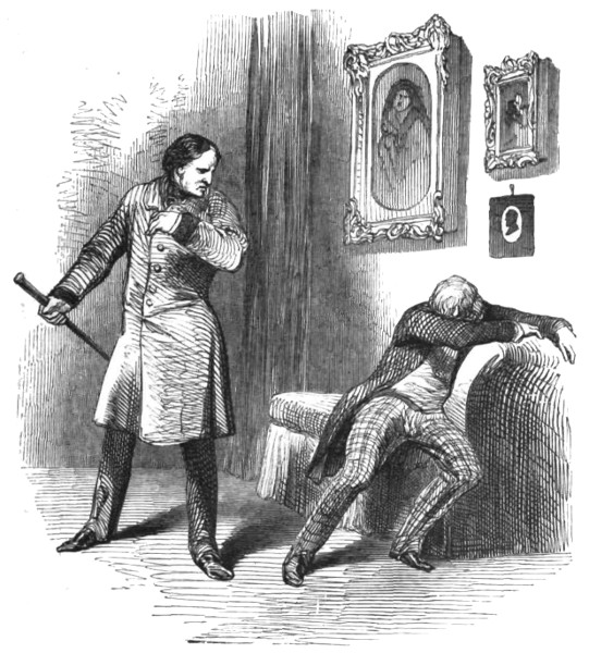We must now direct attention to Captain O’Blunderbuss and Mr. Frank Curtis. Upon the strength of the handsome pecuniary present made to them by Lord William Trevelyan, the former forthwith dubbed himself Major; and for the first six weeks after this self-bestowed elevation, he was under the disagreeable necessity of thrashing his bosom friend soundly at least once a day for being oblivious of the new rank and calling him Captain. At length he succeeded in completely beating into the head of Frank Curtis that he was really a Major; and when they were seated together of an evening over their whisky-and-water, at some public-house, the gallant Irishman never failed to recount to his companion all the military services he had rendered the State, and all the splendours of his paternal mansion of Blunderbuss Park, Connemara. These statements, though ostensibly addressed to Mr. Frank Curtis, were really intended for the behoof of the frequenters of the parlours where they were enunciated; and the quiet tradesmen into whose ears the flaming narratives were thus dinned, ended by being particularly proud of the acquaintance of Major Gorman O’Blunderbuss. At length, what with succulent dinners at eating-houses and oceans of “potheen” every evening, the sum so liberally given by Lord William Trevelyan came to a termination; and the two friends were one day holding a council of war—or rather sitting in “committee of ways and means”—when a paragraph in the newspaper informed them that Lady Blunt and her son had been upset in a boat during an aquatic excursion at Richmond, and drowned “in spite of all the efforts made by the footman to save them.” Up jumped both the Major and Frank Curtis in ectasies of joy, dissolving themselves as a committee then and there by kicking over the table; and away they sped to the mansion in Jermyn Street. The Intelligence was true: Lady Blunt and her son were no more;—and the stout footman was disconsolate. There was no will; and Frank Curtis accordingly found himself, as if by magic, the heir-at-law to all those possessions from which his uncle had sought to exclude him years ago. The day on which the remains of the deceased lady and her son were consigned to the tomb, was the happiest that Major O’Blunderbuss and his friend had ever passed in their lives: for the gallant officer resolved to make a regular Irish wake of it, and the good “potheen” circulated so rapidly that the assembled mourners alarmed the whole street with their noise and laughter. And a most refreshing spectacle was it when Major O’Blunderbuss, with a view to enhance the hilarity of the scene, kicked the stout footman completely out of the house and tossed his clothes and wages ignominiously from the window. In the course of a few days the two friends paid a visit to Mr. Strongitharms, the celebrated engraver in St. James’s Street, for the purpose of having their cards printed with their armorial bearings on the top; and when Frank blandly directed the shopman who took the order to write down in his book the names of Mr. Curtis and Major O’Bluntherbuss, the latter exclaimed in a tone of mingled indignation and disgust, “Be Jasus! Frank, and your mimory grows worse and worse ivery day: for, be the holy poker-r! and isn’t it Colonel O’Bluntherbuss that I am, the new rank being conferred upon me by her Gracious Majesty for my services in the East Indies?”—The shopman wrote down Colonel O’Blunderbuss accordingly; and as a colonel is the gallant gentleman known at the present day. Reader, if you happen to be passing along Jermyn Street any time in the evening after five o’clock, you will hear such shouts of laughter and peals of merriment issuing from one of the houses, that there can be no mistake as to the identity of that dwelling. We need not tell you the number of the mansion, because you cannot fail to discover where Colonel O’Blunderbuss and Mr. Curtis reside by means of the uproarious sounds that emanate from the front-parlour, in spite of the closed shutters and heavy draperies. And to tell you the truth, the neighbours look upon that house as a complete nuisance; and rents are falling rapidly in the immediate neighbourhood—for quiet old bachelor-gentlemen, families, and even young blades about town, are frightened away from the lodgings that are let in the three or four nearest tenements on either side of the one where the two friends have settled themselves. But these worthies care nothing for the opinion of their neighbours and are deaf to all remonstrances: they lead a jolly life after their own hearts and in their own peculiar fashion—and to witness them in their happy domesticity, a stranger unacquainted with their history could not tell that the house and the fortune both belonged to Frank Curtis, for the Colonel is as much master of both dwelling and purse as his devoted friend.