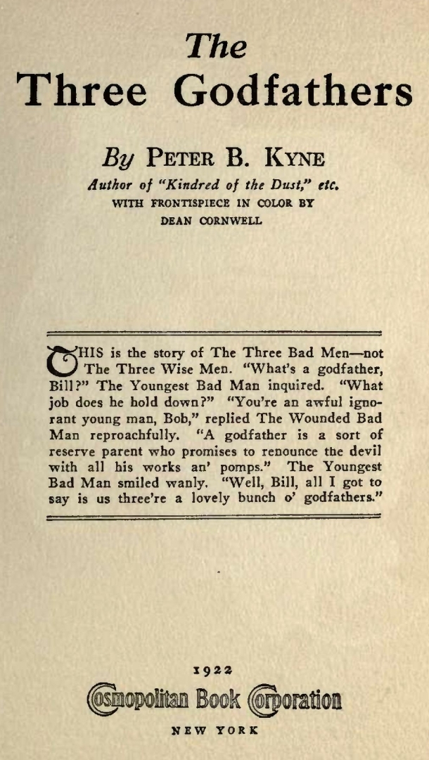 The Youngest Bad Man understood now. He handed over the baby, and together the two godfathers passed out of the shack into the great salt desert... And some time during the night the angels came and led Bill Kearny into paradise.