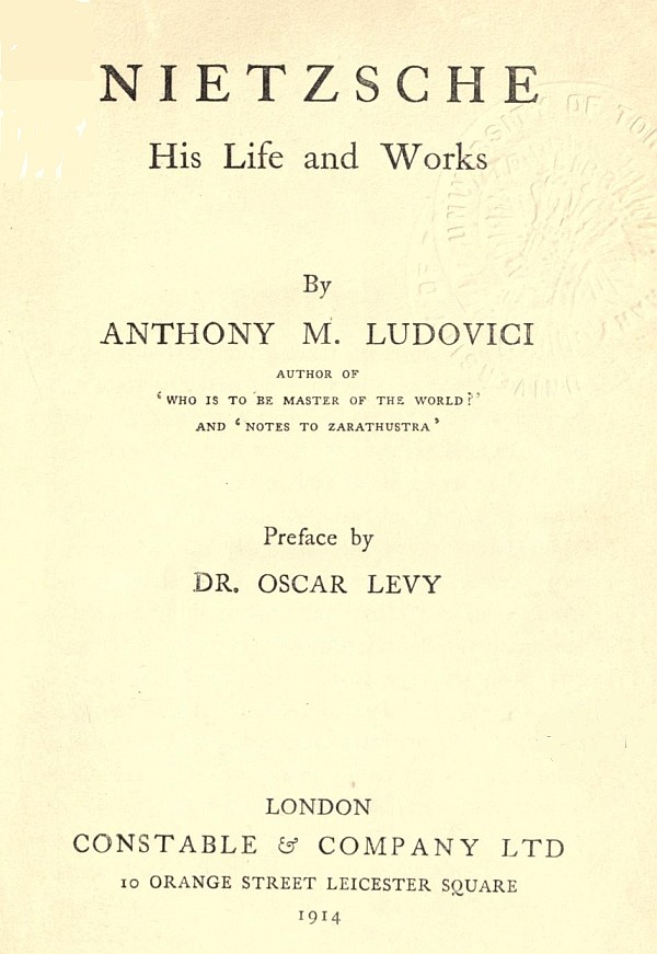 The complete works of Friedrich Nietzsche. Edited by Dr. Oscar Levy. (The first complete and authorised English Translation.) T. N. Foulis, 21 Paternoster Square.