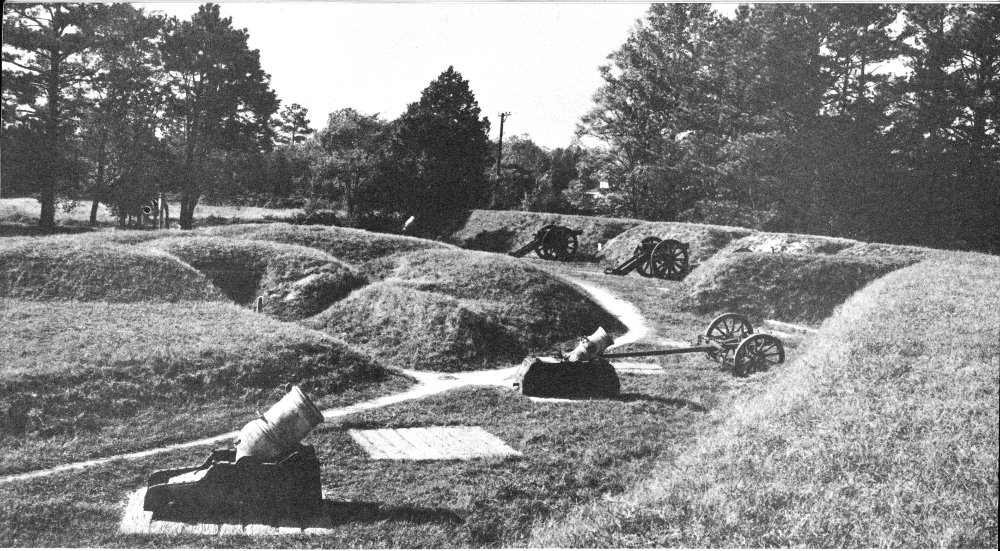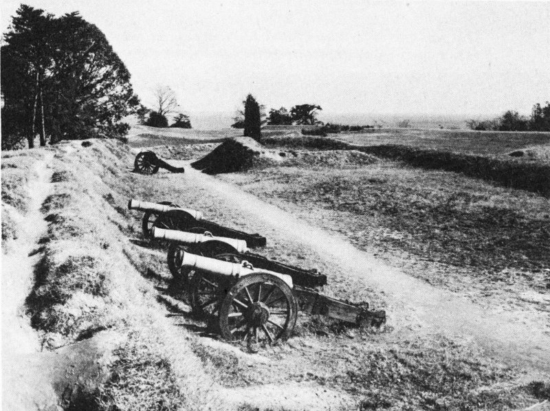 In planning his defense, he established a line of fortifications, close in about the town, supported by small enclosed earthworks, or redoubts, and batteries. Just in advance of the main line he constructed two positions, Redoubts Nos. 9 and 10, to command the high ground in that sector. Along the York-Hampton Road he strengthened the main line by extending it outward on the highway in the form of a point, or wedge, that was called the “Horn-Work.” In the inner and principal line, he had 10 redoubts and 14 batteries in which were mounted some 65 guns, the largest being 18-pounders. Some of this ordnance came from the British ships anchored offshore in the York.