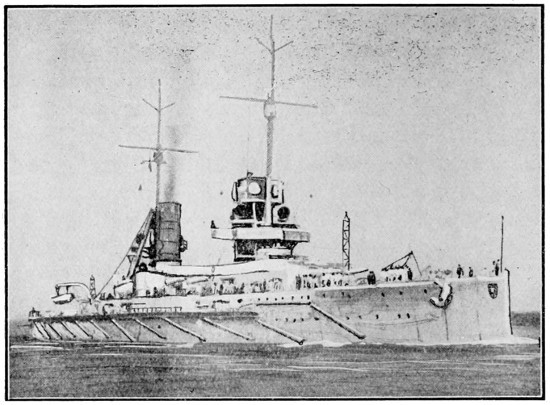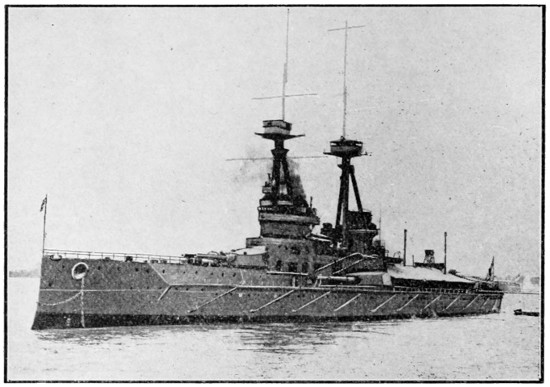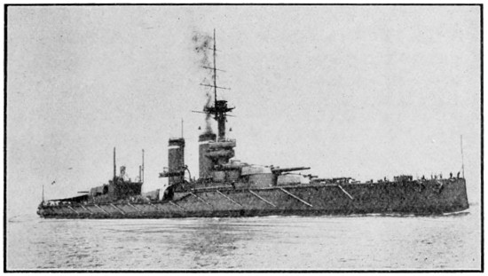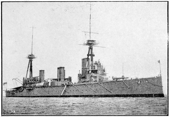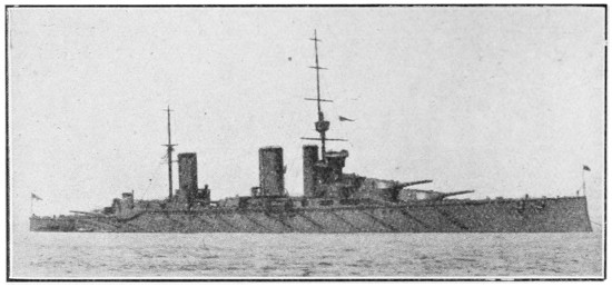 The war in the Far East had shown that changes were necessary in the design of British ships of all classes. The First Sea Lord insisted that the matter should have immediate attention, and a powerful committee of naval officers, shipbuilders, and scientists began its sittings at the Admiralty. The moment its report was available, Parliament was asked for authority to lay down groups of ships of new types, of which the “Dreadnought” was the most famous. In the preceding six years, sixteen battleships had been laid down for Great Britain, while Germany had begun thirteen; our sea power, as computed in modern ships of the line, had already begun to shrink. Secretly and rapidly, four units of the new type—the “Dreadnought,”[25] with her swift sisters, the “Indomitable,” “Inflexible,” and “Invincible”—were rushed to completion. No battleship building abroad carried more than four big guns; the “Dreadnought” had ten big guns, and her swift consorts eight.[3] Thus was the work of rebuilding the British Fleet initiated. Destroyers of a new type were placed in hand, and redoubled progress was made in the construction of submarines, which Lord Fisher was the first to realise were essential to this country, and were capable of immense development as offensive engines of warfare. We gained a lead of eighteen months over other Powers by the determined policy adopted.