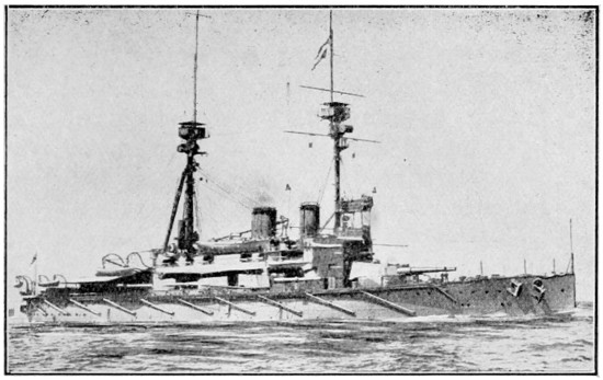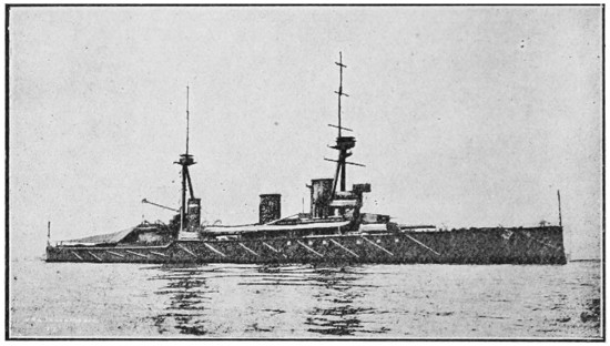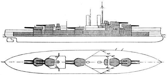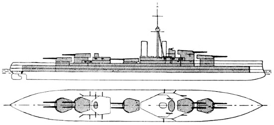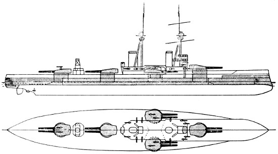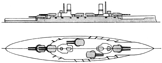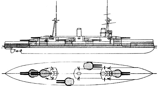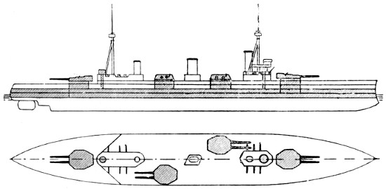 Speed: 22 knots; Guns: 10 13·5in., 16 4in.; Torpedo tubes: 5.