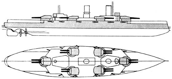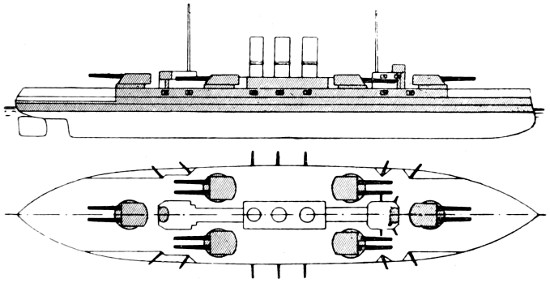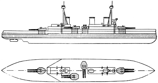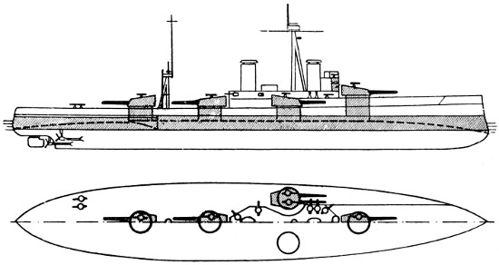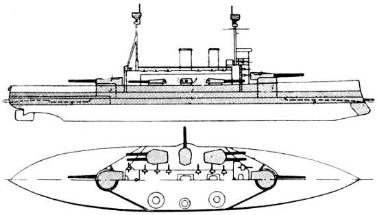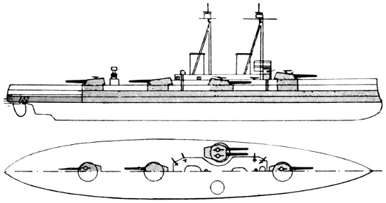 Speed: 22 knots; Guns: 10 13·5in., 16 4in.; Torpedo tubes: 3.
