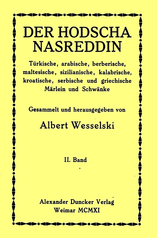 Altbekannte Motive behandelt die folgende Erzählung (Pann, S. 347 ff.): Der Hodscha sieht einmal, wie in einem Hofe ein Diener einem reich geschmückten Esel die Fliegen abwehrt, während der Eigentümer des Esels vergnügt zusieht; er geht hin, umarmt und küßt den Esel und248 sagt: »Schade, daß er nicht reden kann.« Auf die erstaunte Frage des Eigentümers antwortet er: »Freilich kann ich ihn reden lehren, noch dazu in vier fremden Sprachen.« Daraufhin bekommt er den Esel mit nach Hause und dazu ein schönes Stück Geld, damit er das verwöhnte Tier ordentlich pflege; in einem Jahre soll der Unterricht beendet sein. Nasreddins Frau ist mit dem Geschäfte nicht zufrieden, aber er tröstet sie, daß in dem Jahre entweder der Besitzer oder der Esel oder er selber sterben könne, und das Geld habe er ja schon. Am nächsten Tage beginnt er mit dem Unterrichte, indem er dem Esel mit Stockschlägen beibringt, auf einen Wink mit der Hand den Kopf zu heben oder zu senken. Als das Jahr um ist, bringt Nasreddin den Esel zu seinem Herrn, der eine Menge Gäste eingeladen hat. Auf die Frage Nasreddins, ob er wie die andern Esel brällen wolle, hebt der Esel den Kopf zum Zeichen der Verneinung, und so beantwortet er noch eine Reihe ähnlicher Fragen. Den Einwand des Besitzers, daß der Esel noch immer nicht spreche, beantwortet Nasreddin dahin, daß der Esel noch ein kleines Kind sei, das schon alles verstehe, aber zu reden erst noch lernen werde. Der Herr des Esels gibt mit Freuden wieder Geld her, aber nun ändert Nasreddin sein Verfahren; er gibt dem Esel, dem er das Essen abgewöhnen will, täglich weniger Futter, bis er endlich verendet. Als er dann dem Eigentümer des Esels dessen Tod meldet, veranstaltet ihm der voll Trauer ein schönes Begräbnis.
