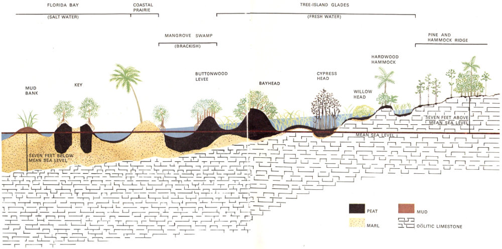 But the relentlessly rising sea of the past 10,000 years has belittled drought, fire, hurricane, and frost as it slowly inundated this land 3 inches each hundred years. In compensation, the mangrove forest adds peat and rises with the sea. The sawgrass marshes retreat, and the mangrove ecosystem prevails essentially unchanged.