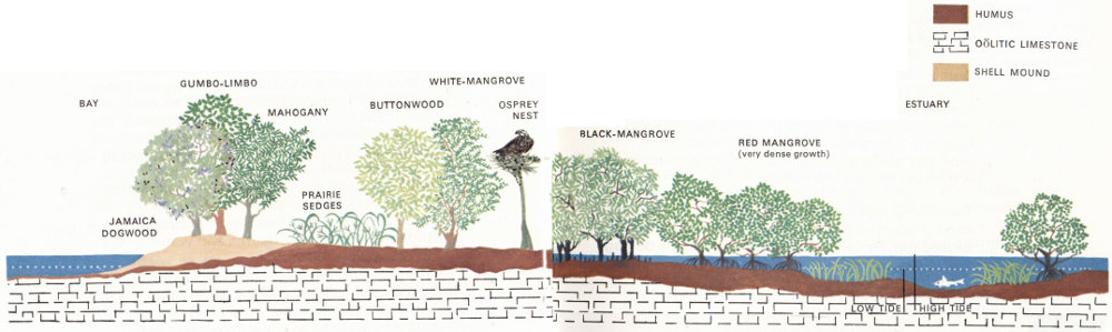 The southward-creeping waters of the glades eventually meet and mingle with the salty waters of the tidal estuaries. In this transition zone and along the gulf and Florida Bay coasts a group of trees that are tolerant of salty conditions, called “mangroves,” form a vast, watery wilderness. Impenetrable except by boat, it occupies hundreds of square miles, embracing both the shifting zone of brackish water and the saltier coastal waters.