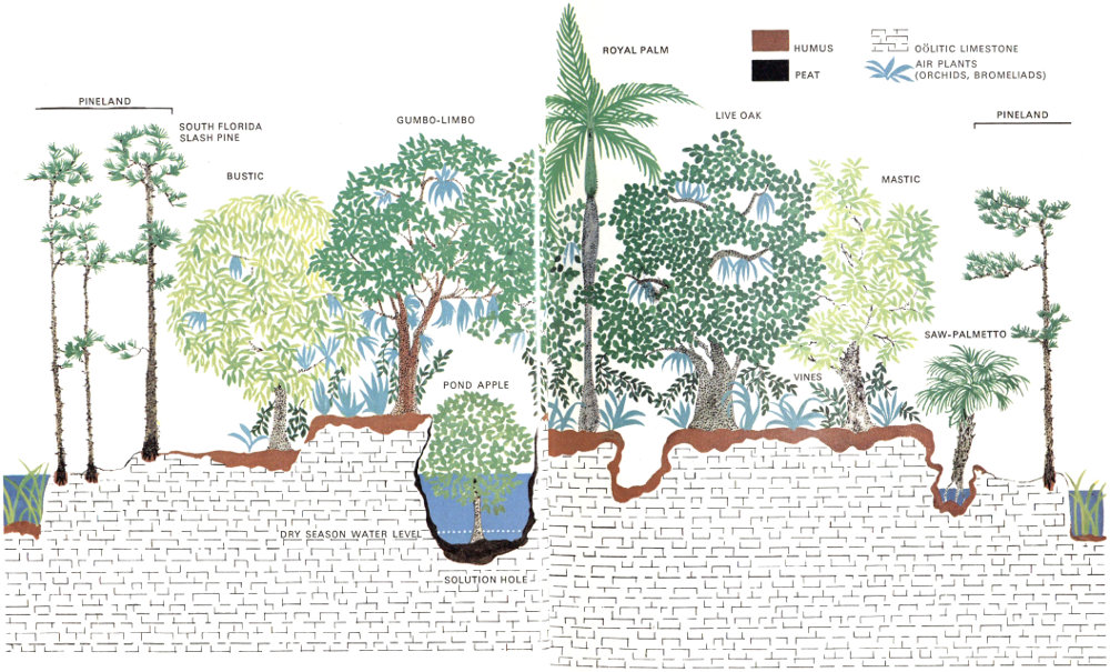 Before this century, fires burned vast areas. The only barriers were natural waterways—sloughs, lakes and ponds, and estuaries—which retained some water during the rainless season when the rest of the glades and pinelands dried up. Old-timers say that sometimes a fire would travel all the way from Lake Okeechobee to the coastal prairie of Cape Sable (see page 2). In the pine forest, any 8 area bypassed by these fires for a lengthy period developed into a junglelike island of hardwoods. We call such stands “hammocks,” whether they develop in the pine forest or in the open glades. On the limestone ridge, the hammocks support a community of plants and animals strikingly different from the surrounding pine forests.