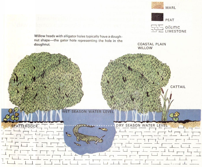 A spot in the glades where the limestone base is elevated just 2 feet will be occupied by a small forest of tropical hardwoods and palms—a 14 “hammock” much like those of the pinelands. A low spot—just a few inches below the general level of the limestone base—will remain wet even in the relatively rainless winter when the sawgrass becomes tinder dry. This sloughlike depression will support a stand of baldcypress, called a “cypress head.” Other tree islands, called bayheads and willow heads, develop in many places where soil and peat accumulate.