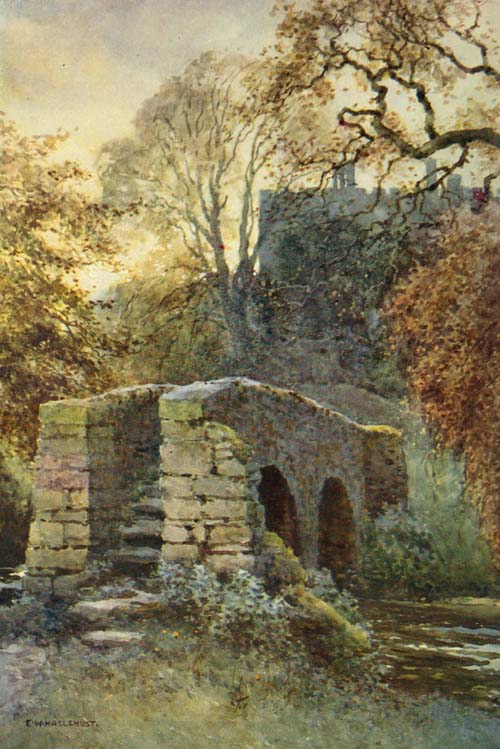 Then Haddon is passed, and the old story—ill-founded to be sure—that Mrs. Radcliffe sought[Pg 10] inspiration there for her glowing romances comes to mind. Even in the richest sunlight the wonderful house suggests mystery and romance. The Wye glides, clear as morning dew, almost level with the green surface of the water meadows. There is, within a stone’s throw of the white road, a little footbridge of the kind that one crosses in happy dreams.