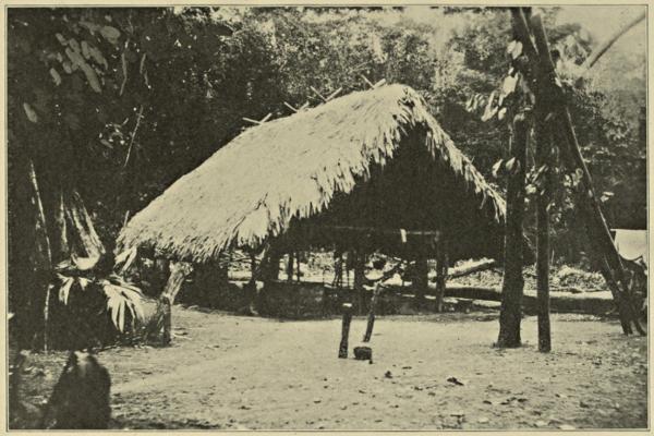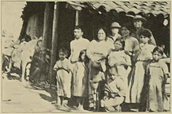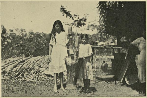 In the evening the poor tired people make their way to their little huts, which are made of a few sticks driven into the ground and covered with straw or palm leaves. There they grind corn for tortillas, the children carrying water in little buckets made of gourds that grow on trees, or in a jar made of clay. Their homes are as dirty as pig-pens, for the animals live in the house with the family.