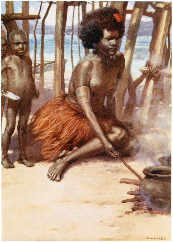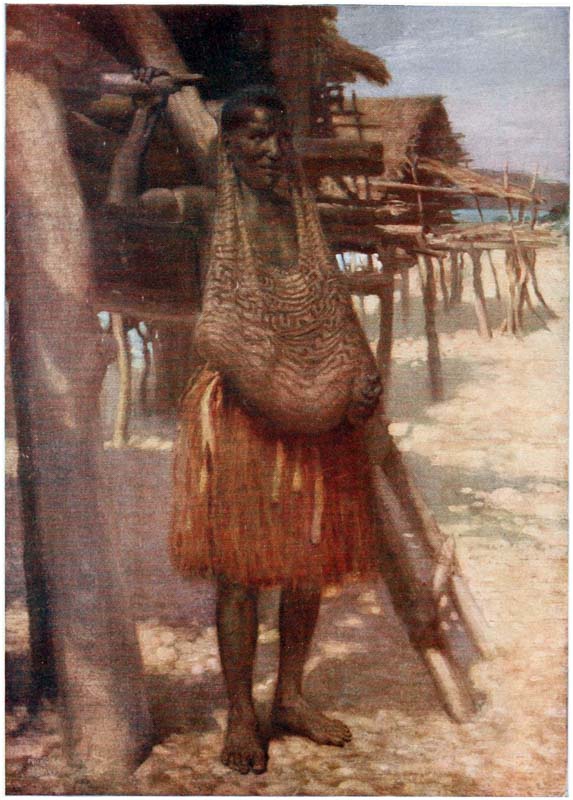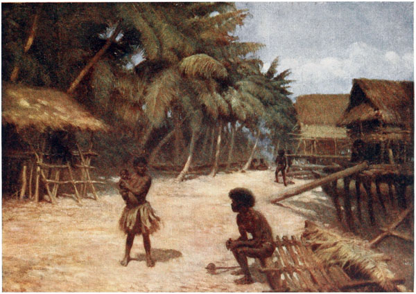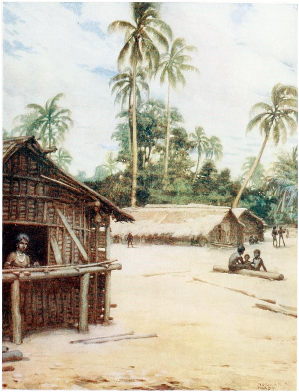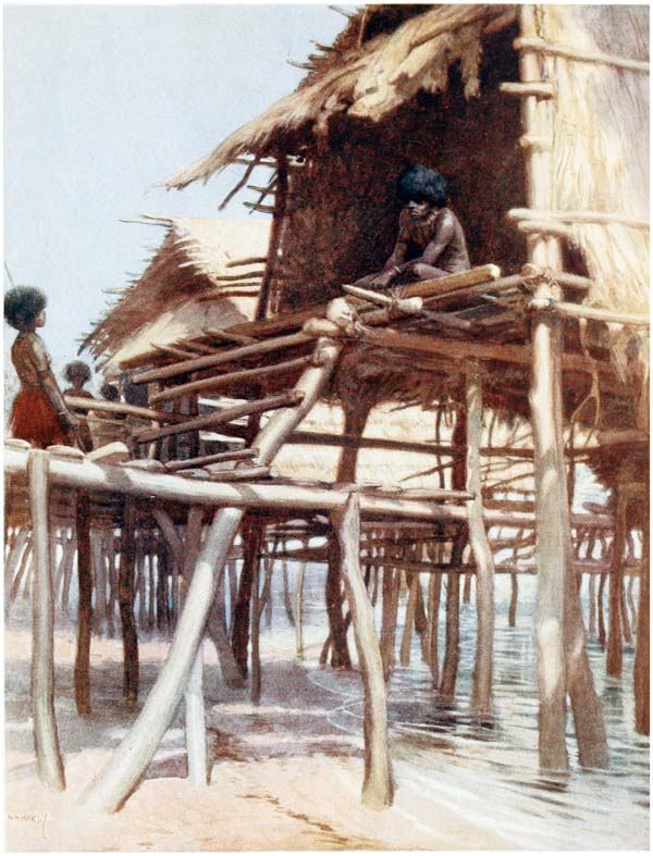 Under the houses, when the tide is out, the natives can be seen cutting out their canoes, making their pottery, repairing their fishing gear and attending to other duties; but they much prefer to loll about on the verandahs of their huts, looking out at the sea, thinking of nothing.