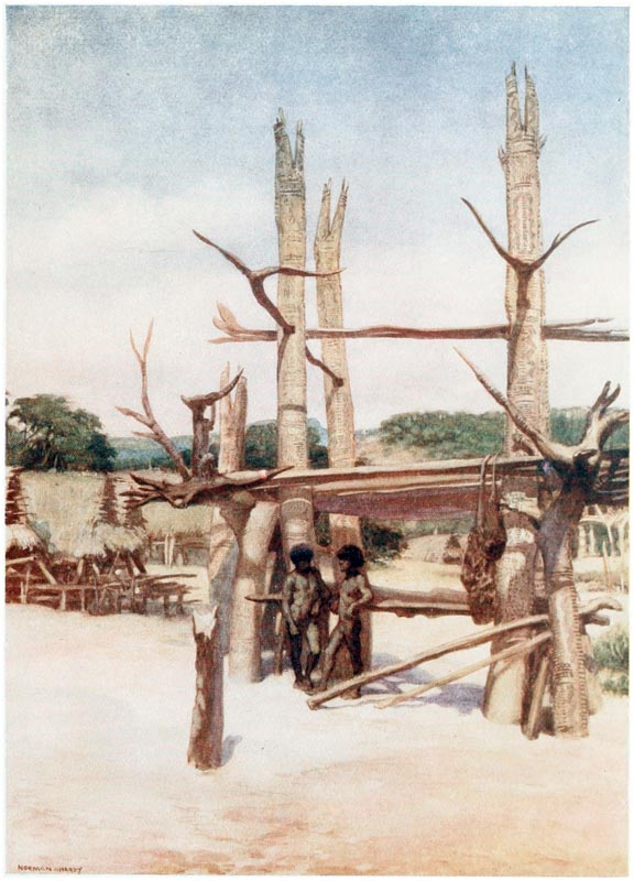The rank yellow smoke which curls round her does not inconvenience her in the least. She takes no heed of it, but blows away at the embers, regardless of smarting eyes and choking throat, probably because she feels neither. She never fears that the fire will spread and burn down her home, but just goes on cooking. If you speak to her she may stop blowing for a second and glance up at you, but never a word passes her lips, and soon she will be blowing again as if it was quite an ordinary thing to have a white man staring at her. But though the smoke does not trouble her a bit, it blinds you, and you soon hurry on to the {20} next hut, and there confine your attention to its outside.