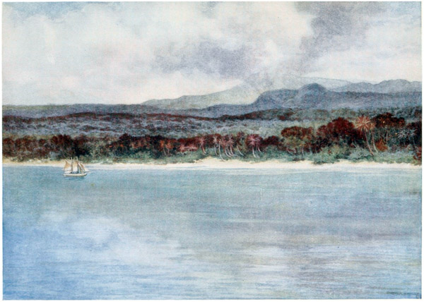 The capital of New Guinea is Port Moresby, a quaintly picturesque village facing a large bay with a natural harbour. In the vicinity are densely wooded hills, which stretch up and disappear in the distance—a dark-green and black mass. But when the sun is on them they dance with colour, and the tints of marvellous brilliancy turn them into a lovely fairyland, full of romance and adventure. It is wonderful what strange tales flit across the mind when looking at these hills; what scenes have been enacted there in times gone by, and now, how calm they seem!