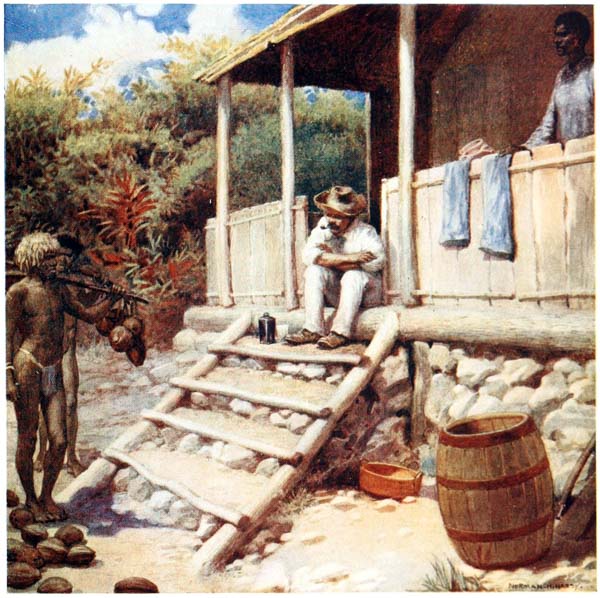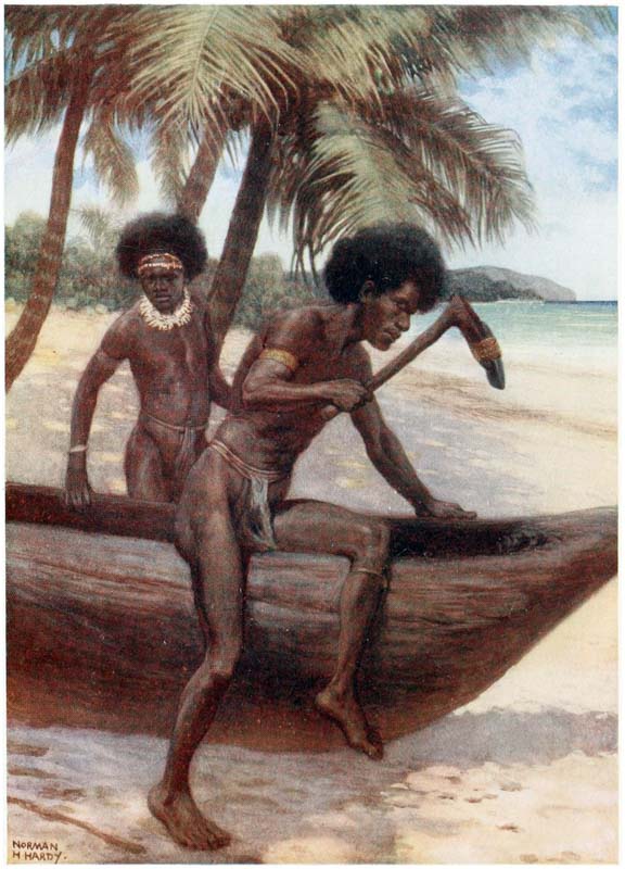 There no islands in the new world which have been the scene of greater adventures, more daring exploits, and more exciting times than those in the South Seas. From the earliest days New Guinea, New Britain, Solomon Islands, and the New Hebrides have been inhabited by a race of savages, on whom neither the efforts of missionaries nor the oaths of traders have been able to make much impression. For years the white man has tried in vain to break the spirit of these cannibals; with fire and sword whole villages have been swept away, but neither by fear nor by kindness have the natives been weaned from their worst customs, and it will take many years and much education, and perhaps the complete extinction of the old generation, before they cease to be savages. For over sixty years {14} the missionaries have been working amongst them and have taught many to read, and sent them out amongst their brethren armed with Bibles and tracts in their native languages, but all this has been of little avail; every day we hear of massacres and risings, and missionaries and traders are pounced on and murdered, and there is no accounting for these outrages which make the problem more difficult to solve. For months or even years men may live on the friendliest terms with a tribe, and then suddenly, and for no apparent reason, the natives will rise up and slay them. The whim of a chief, an angry word, a bad bargain, a superstitious fear, any of these trivialities may be the cause of a rising, and may mean the death of dozens of innocent people.