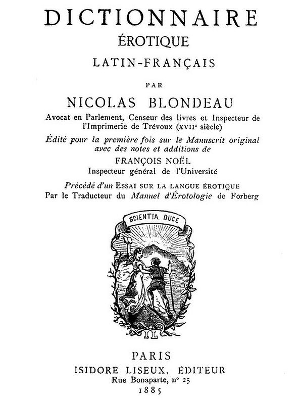 Voici maintenant un second ouvrage, un Dictionarium eroticum Latino-Gallicum, qui peut se rattacher au précédent. Il est aussi du grand siècle, et tout à fait inédit. Son auteur, Pierre-Nicolas Blondeau, n'est guères connu: du moins les Biographies Michaud et Didot n'en font pas mention. Mais une Note1 annexée au Manuscrit, de la main d'un de ses possesseurs, Hyacinthe-Théodore Baron, ancien doyen de la Faculté de Médecine de Paris et bibliophile distingué, nous apprend que Nicolas Blondeau était avocat en Parlement, censeur des livres et inspecteur de l'imprimerie établie à Trévoux, vers 1695, par le duc du Maine, et qu'on lui devait le Dictionnaire classique Français-Latin, connu sous le nom de Boudot. D'après d'autres renseignements, ce dictionnaire de Boudot n'était que l'abrégé d'un grand Dictionnaire manuscrit, en quatorze volumes in-4o, composé par Nicolas Blondeau et qui n'a pas été imprimé.