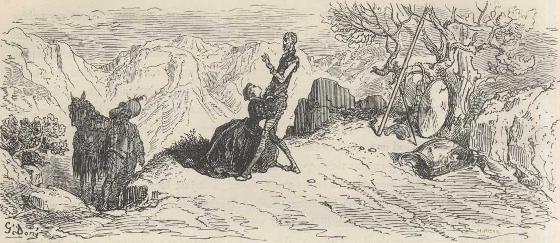 Cardenio and the curate were watching all this from among some bushes, not knowing how to join company with the others; but the curate, who was very fertile in devices, soon hit upon a way of effecting their purpose, and with a pair of scissors he had in a case he quickly cut off Cardenio's beard, and putting on him a grey jerkin of his own he gave him a black cloak, leaving himself in his breeches and doublet, while Cardenio's appearance was so different from what it had been that he would not have known himself had he seen himself in a mirror. Having effected this, although the others had gone on ahead while they were disguising themselves, they easily came out on the high road before them, for the brambles and awkward places they encountered did not allow those on horseback to go as fast as those on foot. They then posted themselves on the level ground at the outlet of the Sierra, and as soon as Don Quixote and his companions emerged from it the curate began to examine him very deliberately, as though he were striving to recognise him, and after having stared at him for some time he hastened towards him with open arms exclaiming, "A happy meeting with the mirror of chivalry, my worthy compatriot Don Quixote of La Mancha, the flower and cream of high breeding, the protection and relief of the distressed, the quintessence of knights-errant!" And so saying he clasped in his arms the knee of Don Quixote's left leg. He, astonished at the stranger's words and behaviour, looked at him attentively, and at length recognised him, very much surprised to see him there, and made great efforts to dismount. This, however, the curate would not allow, on which Don Quixote said, "Permit me, senor licentiate, for it is not fitting that I should be on horseback and so reverend a person as your worship on foot."