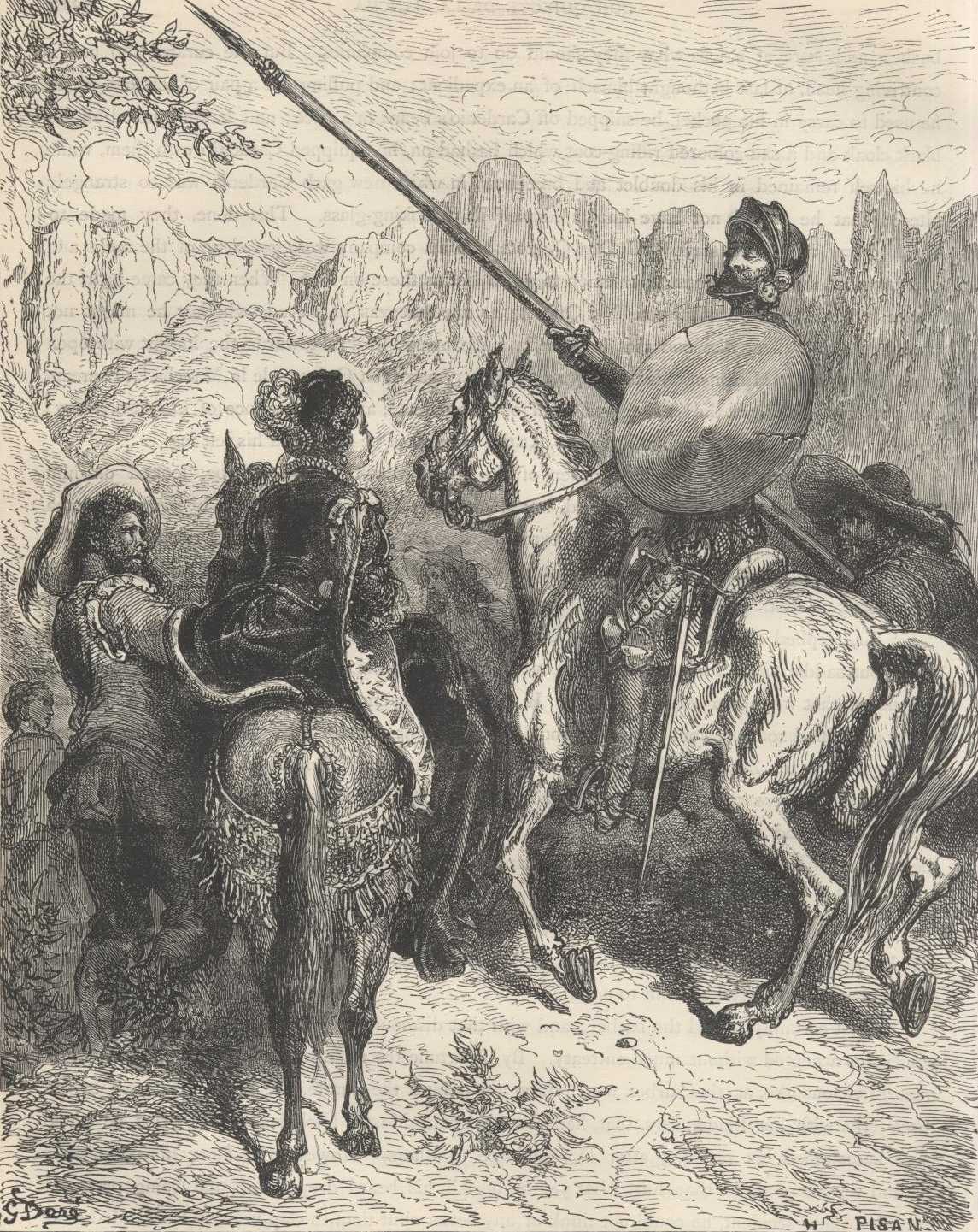 "This fair lady, brother Sancho," replied the curate, "is no less a personage than the heiress in the direct male line of the great kingdom of Micomicon, who has come in search of your master to beg a boon of him, which is that he redress a wrong or injury that a wicked giant has done her; and from the fame as a good knight which your master has acquired far and wide, this princess has come from Guinea to seek him."