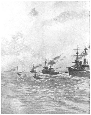 The signal was given, “Open fire and engage the enemy,” and the Inflexible began the battle, followed a few minutes later by the Invincible. This firing was at a range of about nine miles—no opportunities for boarding here, cutlass in teeth, and pistols in both hands!—but the British gunnery was so good that three of the German ships turned away. Then the Glasgow, with the Cornwall and the Kent, gave chase. We shall follow their work when we have considered that of the heavier craft.