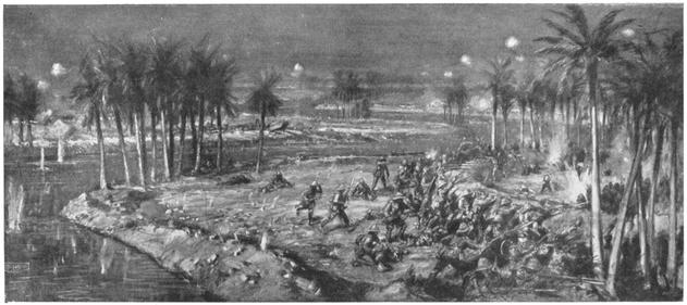 The last fighting before Baghdad is likely to become historic on account of the splendid gallantry of our troops in the crossing of the Diala River. After the action at Lajj the Turkish rearguard fell back on Diala, destroying the bridge which crosses the stream at its junction with the Tigris. We pushed on in pursuit on the left bank, sending cavalry and two columns of infantry to work round on the right bank, and to enter Baghdad from the west. Speed in following up was essential, and the column attacking Diala was faced with another crossing in which the element of surprise was eliminated. The village lies on both banks of the stream, which is 120 yards wide. The houses, trees, nullah, and walled gardens made it impossible to build a road and ramps quickly and to bring up pontoons without betraying the point of embarkation. Hence the old bridgehead site was chosen. The attack on the night of the 7th was checked, but the quality of54 courage shown by our men has never been surpassed in war. Immediately the first pontoon was lowered over the ramp the whole launching party was shot down in a few seconds. It was a bright moonlight, and the Turks had concentrated their machine guns and rifles in the houses on the opposite bank.