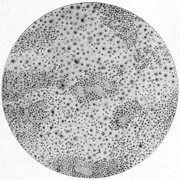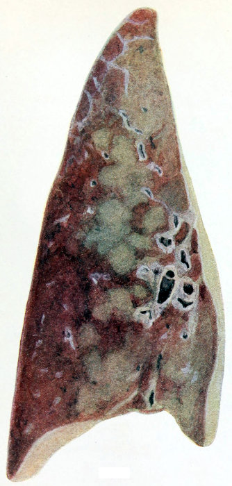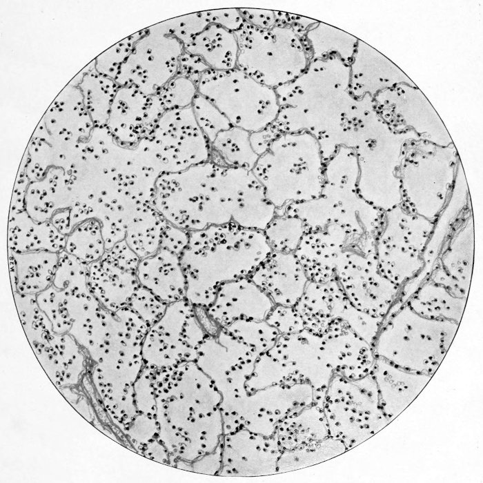 | Fig. v. | Acute hemorrhagic and purulent lobular pneumonia. The purulent process is seen to be advancing from the focal type to the more diffuse lobar by fusion of the neighboring lobules. |