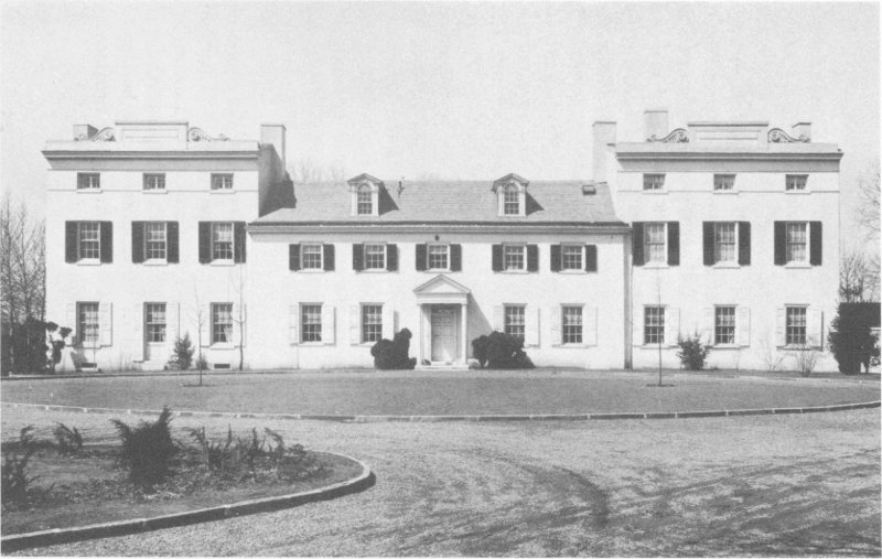 Mr. and Mrs. Fiske Kimball, who occupy the house, have furnished it with appropriate pieces of the late eighteenth century in the Heppelwhite and Sheraton style. In the drawing room is a handsome suite of white and gold furniture in the Louis XVI style, including a settee and twelve armchairs. They were made in Philadelphia about 1800 for Edward Burd. The hangings are of a classic pattern in blue and silver, and over the mantels are a pair of colourful landscapes in the manner of Hubert Robert.
