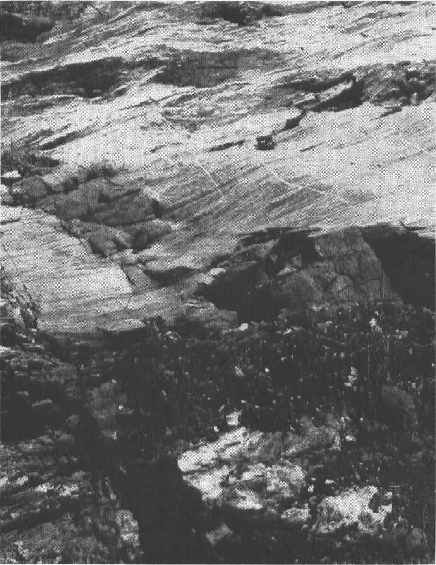The Ottauquechee formation, next above the Pinney Hollow formation and therefore younger in age, was named for the Ottauquechee River along which this formation is well exposed and was first studied in detail. The Ottauquechee River is located just north of Calvin Coolidge State Forest Park where it flows through the towns of Bridgewater and Bridgewater Corners. You can see this formation along State Highway 100A approximately nine-tenths of a mile north of the Park entrance road. Here, the formation crops out on the west side of the road, or on your left if traveling toward Bridgewater Corners (See photograph, Fig. 4). A hike along the recently diamond-blazed Coolidge Forest trail, which leads from behind the Ranger’s cabin to the Picnic area, affords an almost continuous view of this formation. The highly resistant quartzite layers within the Ottauquechee formation are very conspicuous features along this trail as they form several ridges trending across the footpath.