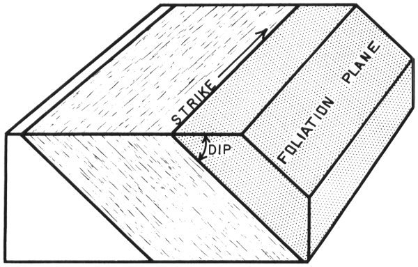 Figure 2. Block diagram illustrating the dip and strike of foliation. The top of the block is considered an “imaginary horizontal plane.”