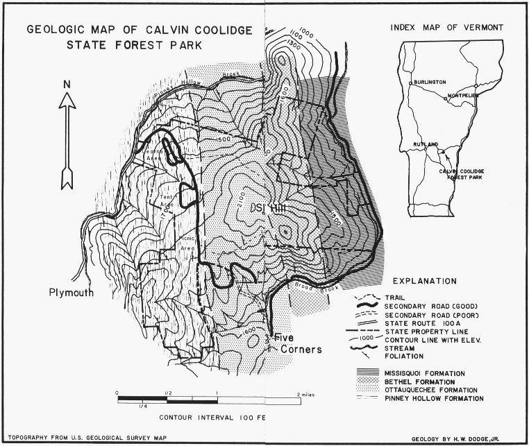 Each summer hundreds of eager campers, picnickers, hikers and sportsmen visit the Pinney Hollow-Bradley Hill recreational area of the Calvin Coolidge State Forest Park. This area is located a few miles north of Plymouth, Vermont, and is easily reached via State Route 100A from either Plymouth or Bridgewater Corners (See index map of Vermont, geological map). The excellent camping and recreational facilities coupled with the natural scenic beauty of this region provide many visitors with an irresistible urge to return, summer after summer, to this same spot. This pamphlet is designed for all those who visit Coolidge Forest Park and especially for those who possess questioning minds and a general desire to learn more about the world around them.