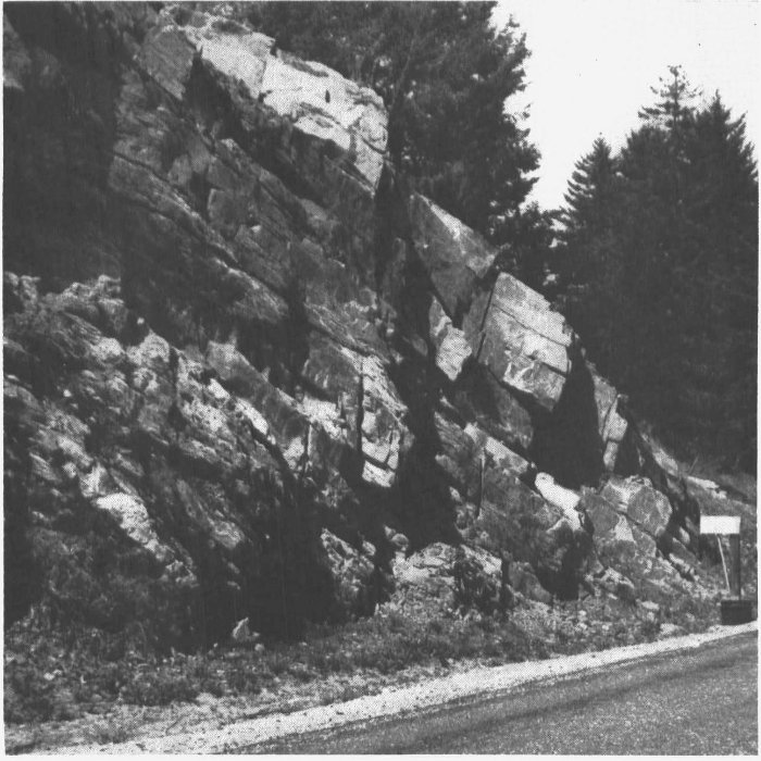 Figure 4. The Ottauquechee formation as exposed approximately nine-tenths of a mile north of the Park entrance road and on the west side of State Highway 100A. Note the massive quartzite layers above, the black phyllite below.