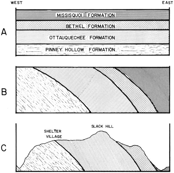 Figure 5. Diagrammatic cross sections illustrating the geologic history of the Calvin Coolidge State Forest Park. Vertical scale greatly exaggerated. Patterns to designate formations in cross section A are repeated in cross sections B and C.