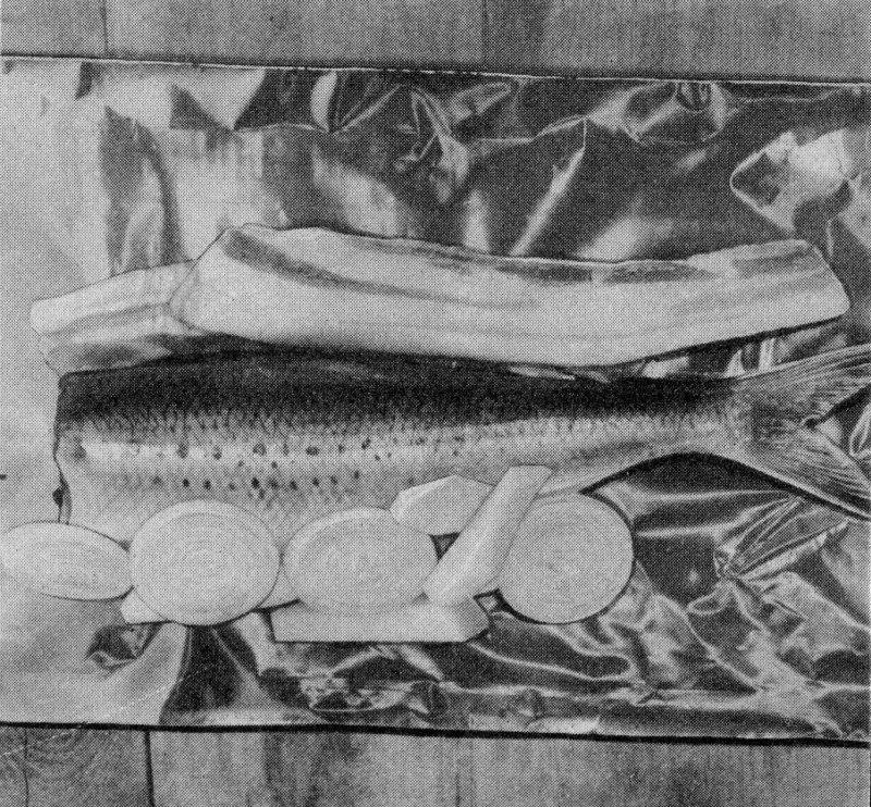 DIRECTIONS: Clean and wash the fish and vegetables. Take about 26 inches of Reynolds Wrap. Place ½ slice of bacon on the wrap. Place fish on top. Slice potatoes in ¼ inch slices and place on top of fish. Slice onions in same manner and place around sides and on top of potatoes. Put another slice of bacon on top of potatoes and onions. Carefully fold foil and crease over to seal. Now fold in the ends to seal in all moisture. Caution—do not make a hole in the wrap.