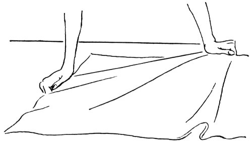 After cutting lengths, check to see if the ends of the fabric are square. If not, square the crosswise edge by pulling the low corner on a true bias from opposite side of the fabric. Sometimes dampening the fabric will relax the threads and make straightening easier.
