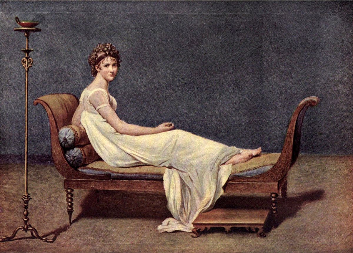 The sitter wears a white Empire dress, the train of which hangs down to the ground from the Empire sofa on which she is half reclining, with her left elbow resting on a pair of round horse-hair bolsters. Her face is turned towards her right shoulder. A wide black riband is tied round her fair curled hair. A low footstool in front of the sofa on the right, and a standing candelabrum of classic design on the left.