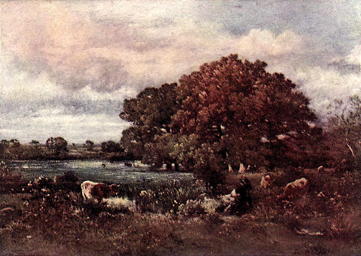 Of all the Barbizon painters and their artistic kinship, Charles François Daubigny (1817–1878) is the one who approached nature with the most reverent spirit. He is in a way the least subjective of them all, because his love of nature even in her simplest aspects prevented him from imposing his own personality upon her; and for this very reason he is more varied in his range of landscape subjects than any of the other masters of this important group. The most fugitive effects of light and atmosphere were seized by him with a masterly sureness which found expression in every touch of his summary brush. Every hour of the day, every season of the year, every mood of nature appealed to him with equal intensity, although the choice of his subjects is most frequently inspired by serene optimism.